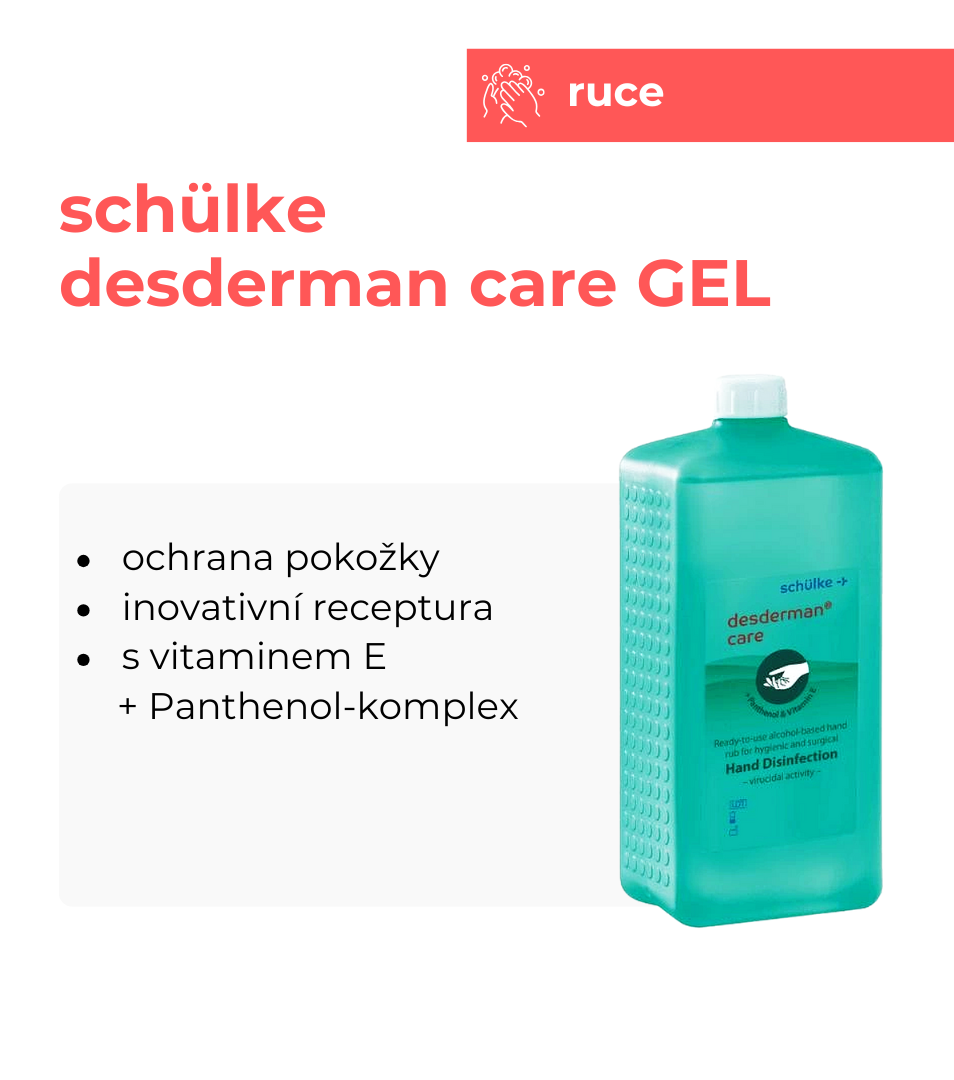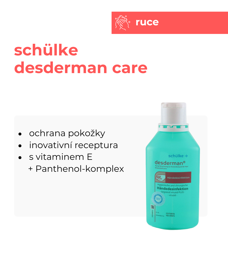 Na dezinfekci rukou doporučujeme desderman care - aplikuje se na čisté, suché ruce a je virucidní do 30 vteřin. Navíc díky inovativní receptuře s obsahem Pantenol-komplexu a vitaminu E zajištuje vynikající péči a ochranu pokožku.