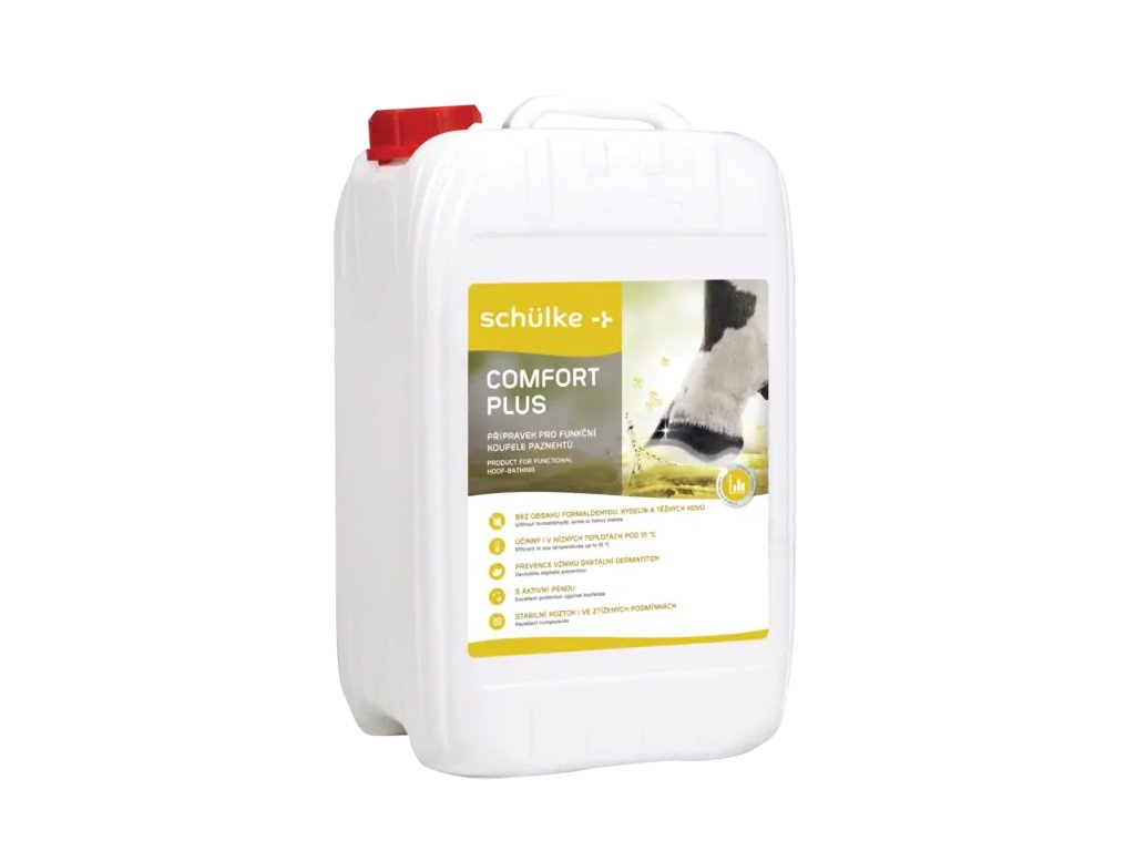 comfort® plus je určený pro pravidelné koupele paznehtů a kopyt skotu, ovcí a koní. Účinně likviduje mikroby, které způsobují nejrozšířenější infekční nemoci paznehtů. Zlepšuje strukturu rohoviny a její pružnost. Vytváří souvislou pěnu na povrchu lázně a výborně odstraňuje ulpělé nečistoty z povrchu paznehtů. Lze používat i při nízkých teplotách okolního prostředí. Je účinný po celý rok. Vytváří stabilní roztok i při ztížených podmínkách. Dezinfekce paznehtů probíhá bez pronikavých par, zápachu a toxických účinků formaldehydu.